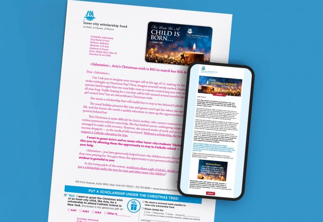 This copy across all platforms tugged on the heartstrings of donors, reminding them of when they were young students looking forward to gifts on Christmas. However, for the children Inner-City serves, the gift they are hoping to receive is a scholarship that will allow them to remain in their Catholic school and further their education. We focused on leveraging this emotional story to impress how important the donor’s contribution is.